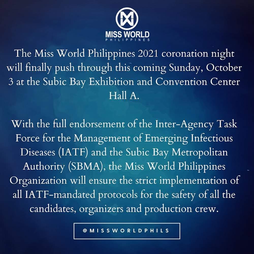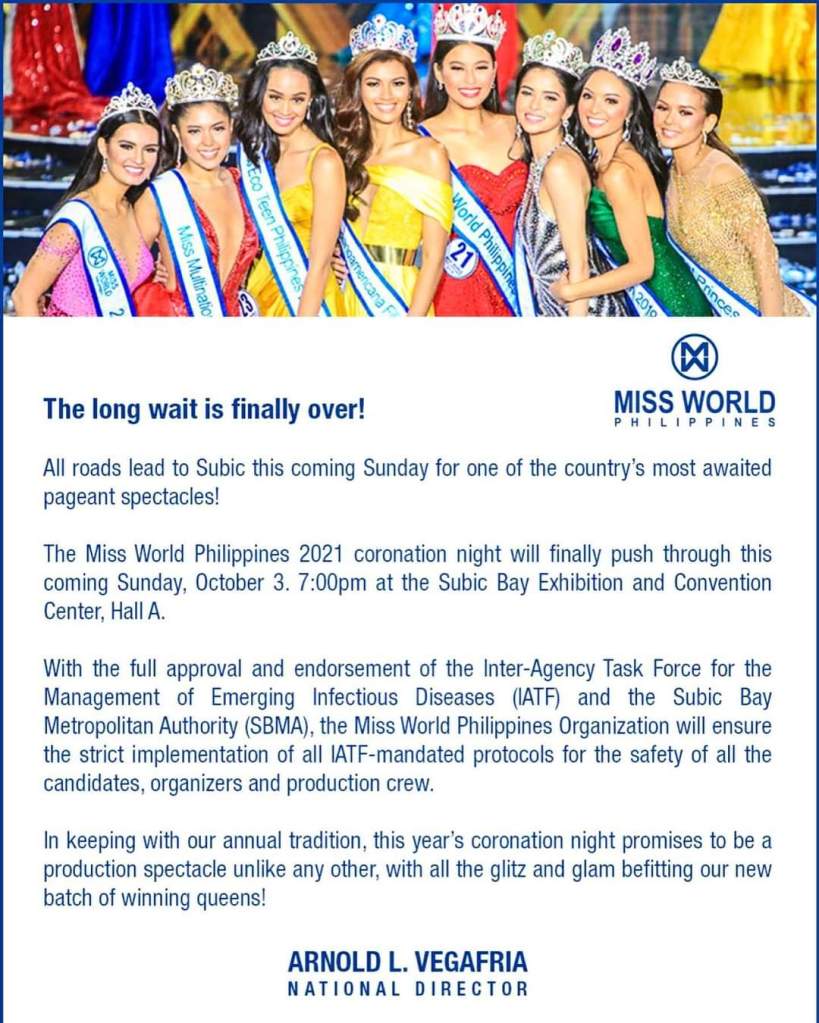 Miss World Philippines 2021 Finals on October 3, 2021 Posted byflxmanuelOctober 1, 2021October 1, 2021Posted inUncategorized Finally!!! Share this: Click to share on X (Opens in new window) X Click to share on Facebook (Opens in new window) Facebook Like Loading... Related Published by flxmanuel i am a Registered Nurse and a huge pageant fan... View more posts