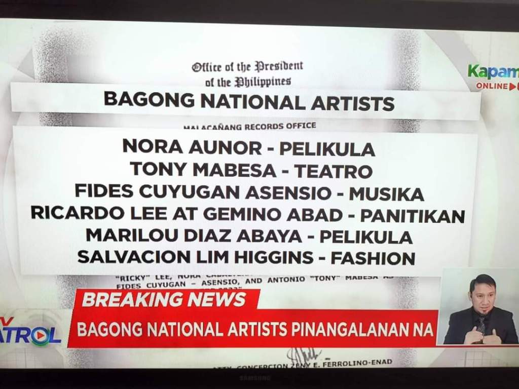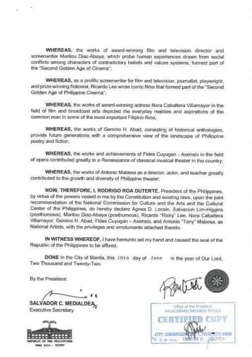 Malacanang Palace declared eight ( 8 ) new National Artists for 2022, namely Agnes Locsin for Dance, Salvacion Lim-Higgins for Design (Fashion), Nora Villamayor a.k.a Nora Aunor, Ricardo “Ricky” Lee and Marilou Diaz-Abaya for Film and Broadcast Arts, Gemino Abad for Literature, Fides Cuyugan-Asensio for Music, and Antonio “Tony” Mabesa for Theater.