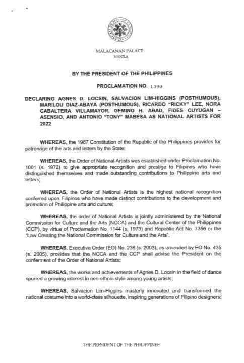 On June 10, 2022, Malacanang Palace, upon joint recommendation of the National Commission for Culture and the Arts (NCCA) and the Cultural Center of the Philippines (CCP), officially announced the eight ( 8 ) new National Artists by virtue of Proclamation no. 1390.