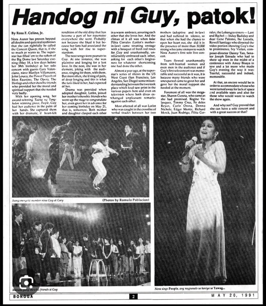 I was so amused whenever I saw pictures of the gargantuan crowd that usually greeted our Superstar during the height of her popularity…I witnessed the same thing in 1991 during her “Handog ni Guy” concert! Araneta Coliseum was packed to the brim! I have never seen so much love and respect from her fans! I saw old fans with their children beaming with pride knowing they made their parents happy upon seeing their one and only Superstar! I was just so lucky that I had 2nd row tickets from Mr. Mike Enriquez! Tito Mike, my best friend’s uncle,usually gives us tickets to concerts.I would not have the money to buy those during that time. It was also the first time to miss the evening telecast of Miss Universe! After watching the morning telecast of the pageant, we had to proceed to the Big Dome! One scene that was edited from the tv telecast was the part when fans were allowed to give her flowers, this was so poignant for me. La Aunor nearly drowned in flowers! This was the first time I saw the Big Dome so full.The next event that I saw the Big Dome packed was during the 1993 UAAP Men’s Sr Basketball Championship between UST and Adamson.